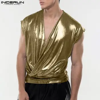 INCERUN 남성용 탱크 탑, 스파클링 V넥, 민소매 캐주얼 남성 조끼, 스트리트웨어, 솔리드 여름 패션, 남성 의류 S-5XL, 2024
