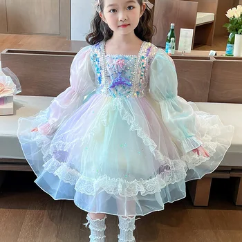 여아용 겨울왕국 안나 엘사 가을 원피스, 긴팔 메쉬 공주 원피스, 우아한 소녀 파티 드레스, 어린이 옷 3-8 세