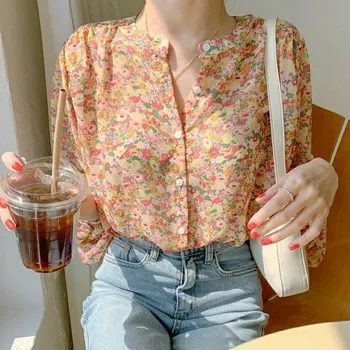 여성용 우아한 프린트 쉬폰 블라우스, 용수철 여름 캐주얼 긴팔 V넥 루즈 셔츠, 오피스 레이디 단추 스위트 탑, 2023